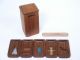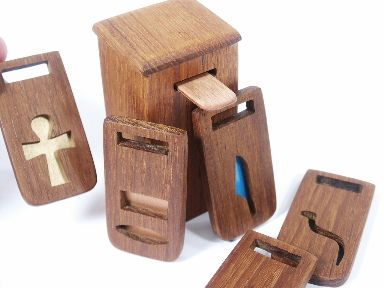 Five wood tablets each having a different Egyptian Hieroglyphic symbol are shown and all have a slot at the opposite end of the symbol. The spectator is given a free choice of one of the tablets and all tablets are stacked together and dropped into a wood cover and a strip of wood is then passed through this securing all of the tablets.