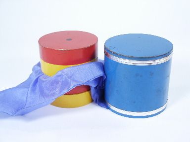 Four Checkers in all 2 Yellow and 2 Red are covered with a silk and a cover is placed over all. When the cover is removed it is seen that the top two checkers have penetrated the silk with the magician showing the two below as he lifts the silk. The cover is once again placed over the checkers with silk and upon removing again it is seen that all four checkers are now above the silk! Includes silk and instructions for this baffling penetration. Shows some use, light soil. Condition fine. | |