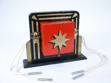 A large 5 1/8 inch block brilliantly lacquered in red and gold with a hole running through its center is shown and two ropes threaded through the hole and locked into a frame with the ropes through the frame draped on either side.
