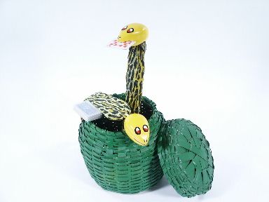 The deck is tossed in and the magician's snake is commanded to show his talent. Before long on his own motive power he comes up out of the basket and low and behold the selected card is seen tightly held in the mouth of the snake!
