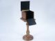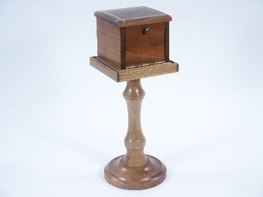 A special order item from Mel Babcock based upon a clever idea for the production of a block such as a large die or whatever item you may have in mind that will fit within the interior of this 4 1/4" box. Beautiful solid woods with inlay having a front door with brass knob and a rear hinge lid. The pedestal is 10 1/2" high also of beautiful solid woods and the top is recessed to accommodate the production box. The top lid of the box has a slight bow not affecting working otherwise very fine and a clever principle. Includes instructions. | |