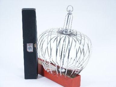 This cage is in need of a tune-up as in cleaning/lubrication and adjustments as not all of the bars spring open into the correct position. This cage is trademark stamped and includes instructions and in the original box.