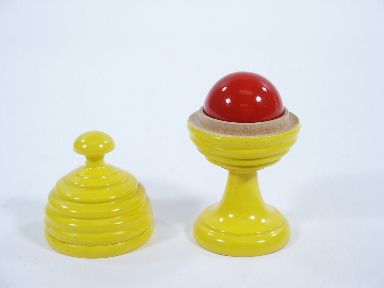 This is a really fine vase of wood standing 3 5/8" high having a red ball 1 3/16" in diameter. It is stamped Germany on the underside. These are not usually seen in this very fine condition.