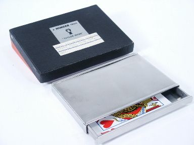 This case is quality made of stainless steel and is essentially a locking style drawer box which will enable *Vanish *Production Vanish Exchange or *Restoration of a Playing Card. This case is smooth finish without the diamond shape ornament originally placed there for a monogram to personalize the case as the case was thought by spectators to be one that held cigarettes. Includes illustrated instructions and in the original box. Condition very fine. | |