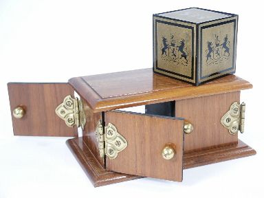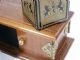 It stands to reason that the master deceiver Richard Himber would come up with his own version of the classic Sucker Sliding Die Box and what you see before you is his invention. Going by the name of King's Block this was in a very small run limited to no more than 25 in all not saying that 25 were ever built. The first 6 of these went in order to *Dell O'Dell *Doc Tarbell *Cantu *Frakson *Ade Duval and *Milbourne Christopher. In Mr. HImber's version of this classic effect you begin by showing the walnut wood box with ornate brass hinges having four doors two at the front and two at the rear along with 3 1/4" block in Gold and Black decorated with Coat of Arms design. The block is shown and dropped into a hat (not supplied) to free the magician's hand so the box may be shown with all four doors opened showing nothing being concealed within. The doors are closed all but one and the block is removed from the hat and placed in this open door and the door closed. A sucker routine is used by tilting the box to one side and opening the doors on the opposite side showing the block has vanished. Doors closed and the box is tilted toward this side and then the opposite side doors are opened showing block has vanished. After much back and forth with the audience all four doors are opened showing the block has completely vanished and the block is removed from the hat! Once again the block is placed in the box as before with the routine going the same as before and at the finish all doors are opened again showing the block has indeed vanished. With all eyes now upon the hat the magician reaches in as before and this time instead of the expected block an orange is found within and the hat shown completely empty as it was at the beginning of the effect. Includes instructions. Condition fine. A very Scarce original Himber item. | |