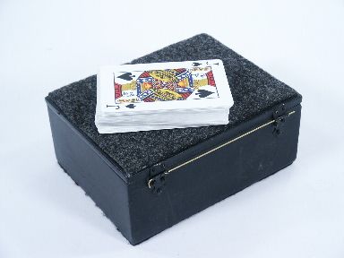 The performer opens the lid of a small wood chest and removes a deck of cards which may then be placed within a glass (not supplied) atop the chest. Three cards are then caused to rise up and away from the rest of the pack one at a time and at the will of the magician. This is a nice little set up and the chest contains the mechanics below a removable panel. Needs no batteries as this is the way it was done before by simple wind up mechanism. Condition very fine. | |