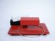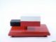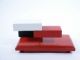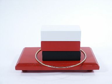A base of wood with four elevation posts is shown with three blocks in colors of red, white and black. The stacked blocks have the black bottom block moved away from the other two blocks and a small knob (not supplied) is placed under the red block. The white block is moved to about 1 1/2" from the edge of the red block. The small knob is removed and it appears that the red and white blocks are suspended in air, a ring is now passed around the red and white blocks! Includes instructions. Condition very fine. | |