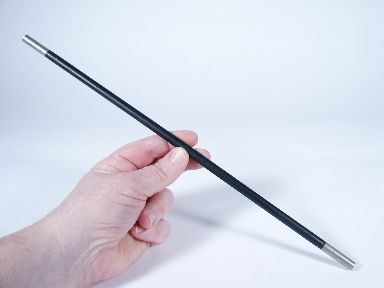 This slender wand 14" long with a 5/16" diameter will with its mechanical properties enable for a beautiful vanish of a silk (not included). The magician takes a silk in hands and rolls it into one hand leaving it there. The magician takes the wand and pushes it into the hand holding the silk giving a peek at the silk still there. The wand is passed around the hand and laid aside and slowly the hand is opened showing the silk has vanished without a trace. Includes illustrated instructions. Condition very good. | |