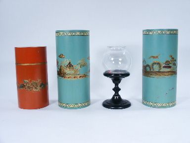 Perhaps one of the best and most deceptive of all of Okito's items and as much as you would want to acquire this and set it upon the shelf to admire this is indeed one to perform. After showing a can used to hold tea the lid is removed and personal items are borrowed from members of the audience. The lid is replaced and set aside and two cylinders are shown empty one being used to cover the tea can and the other is placed on a table some distance away. The magician states he will cause the tea can to pass from the one cylinder over to the empty cylinder. After making the magical gesture the magician walks over to the empty cylinder and lifts it away and the tea can has arrived! Immediately the lid is removed and the borrowed items are taken from within and returned to the owners! In the case that there might be skeptics among those in the audience the magician walks back to the first cylinder. Proving that there are not two tea cans the magician lifts away the cylinder and to the amazement of all a small bowl of water with goldfish resting on a turned wood pedestal has made an appearance! Both cylinders are again shown perfectly empty! Some paint absence occurring to the cylinders with some wear to the tea canister transfers, overall set in very good condition. Includes directions. Don't pass by this excellent performance effect that was handmade by Okito himself. | |