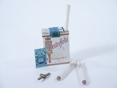 With this mechanical apparatus the magician will be able to cause not just one cigarette to rise up from the pack but a second as well and in very quiet fashion. Precision made in metal and one seldom seen. Condition first rate.