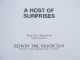 A Host Of Surprises Edwin, More Novel Magic from Edwin Hopper, Founder of The Supreme Magic Company. 1990 cloth bound with foil stamping, 313 pages with photos and illustrations. Contains 14 Chapters, Tricky Rope Tricks, King Of The Kids, Kiddie-Rama, Cards With A Touch Of Mentalism, Silky Things, Jumbos And Giants, Micro Mysteries, A Card In The Glass, A Magic Miscellany, The Lucky Bran Tub, Topping Tricks With Toys, Clearly Clairvoyant, Last In The Book. Cover bends. Condition very fine. | |