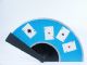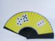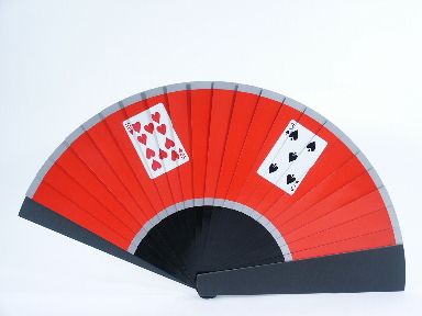 This is a beautifully made fan 11 3/4" in length when closed and will exhibit colors of red, yellow, blue, green and each time a different color is shown the cards upon the color surface are different as well. A real beauty and durably made in very fine condition. | |
