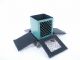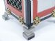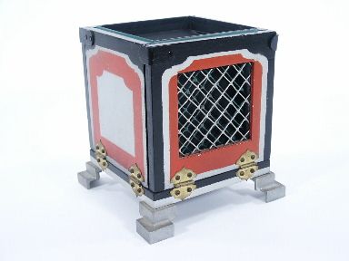 A hard to find item, circa 1940's, that is a well built mechanical piece of apparatus clever by its design and working. The magician exhibits a wood box having tiered metal feet in a size overall of 6 1/4" wide x 6 1/8" deep x 6 3/4" high. Showing the box all around the magician pivots up a latch at the top allowing the four sides to lay down as each side is connected with two brass hinges. The box is shown around in this fashion with an inner box having an open grill front like the main cabinet has as well. The magician takes up this inner box and the main box is picked up and the base is turned toward the audience showing it all around. The inner box is placed back with the outer box and the sides are raised and fastened together as before. The inner box is removed and the open top is turned toward the audience giving a last look to the bottom interior showing nothing contained within. This inner box is replaced and the audience clearly sees the magician's hand through the grill of both boxes. The magician may now produce many silks and all can see that the silks come from the very center of the box. (No silks supplied.) The instructions state, the load may be 25 or 30 silks 18" in size or the equivalent in quantity. The great magic Collector Charles H. Larson stated "The Haenchen Production Box... that is a beauty. It works like a dream. I am very proud of it. It is the finest one I have seen and you know I have several of them. It fools everyone." Includes instructions. Condition very fine and scarce. | |