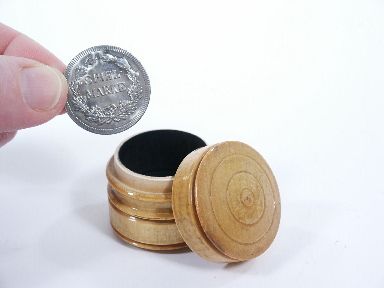 An early wood turning from Germany that will enable the vanish of the supplied coin by placing it within and closing the lid. Condition very fine.