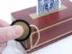 The machine measures 6" x 3 1/4" x 2 1/2" high made of mahogany wood and trimmed in Gold with having four acorn shape feet in Brass. Also includes deck of Bicycle Poker Cards. Includes instructions. Condition very fine.