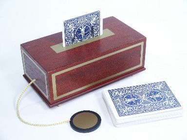 This card is shuffled into a group of cards and after doing so the cards are placed one at a time into a slot in the top of the machine. The machine sits quietly until one card is placed into the slot and an alarm inside the machine suddenly goes off! The card is shown and the spectator verifies that is indeed the selected one!