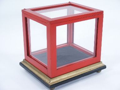 This crystal chest for birds and silk made by Don Redmon of Redmon Okito fame in the early 1950's. Standing 8 1/4" high with brass ball feet with chest portion measuring 7 5/8" wide x 6 3/8" deep x 6 3/4" high having a brass hinged lid at top. The chest is built of select hardwoods finished in hard lacquers making for a sturdy and desirable piece of equipment.