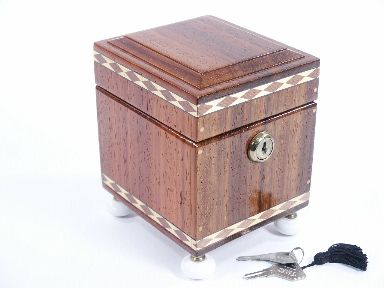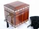 Beautiful all wood chest with banded inlays and porcelain feet having a key lock access. Stands a little over 6" high x 4 1/2" wide x 5" deep this has a built in feature which allows for automatic closing of secret access to interior. Includes special loading chute of custom fabricated plex and a well made stitched velvet bag with drawstring for vanished article(s) to appear within. No instruction given as this is a wonderful utilitarian piece of apparatus. The working shall become apparent once you have in hand. In beautiful condition. | |