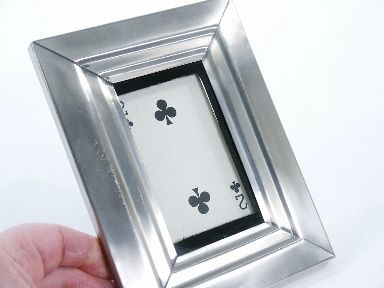 A selected card is torn into quarters. The four pieces are then thrown at an empty frame, one at a time, and they magically appear inside beneath the glass like a jig-saw puzzle! The completely restored card may then be removed from the frame and tossed out into the audience for examination. So beautifully crafted and made in stainless by Merv Taylor for Richard Himber and the nicest one I have seen. Includes instructions and in wonderful condition. | |