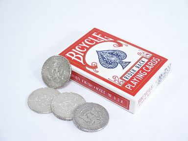 The instructions mention use of a slit coin glass and as this is not supplied you will supply your own or make use of another method of acquiring the coins. Instead of using the glass placed atop the deck of cards some magicians prefer to use an Okito Box.