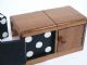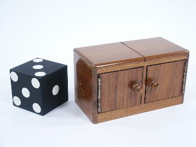 Built with matching grains of solid walnut wood and making use of piano style hinges, this die box measures 7 5/8" wide x 4 1/4" high x 3 7/8" deep having a nearly 3" die. In addition to the quite audible sound device this also has the feature of a double door to further enhance the routine. Other than minor scuffs in the finish this quality made box in very fine condition. | |