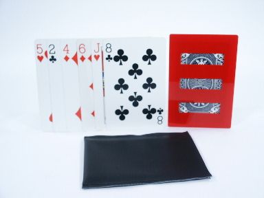 Six jumbo cards are shown with the explanation that they represent six bullets. A beautiful lucite frame with openings is shown and explained it will be the target. The frame is placed in a cover which is leaned up against some object so it remains in a vertical position.