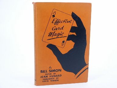 Effective Card Magic, Bill Simon, 1952, 1st Edition, pictorial cloth bound, 181 pages, illustrated. Contents: Choice Tricks, The Second Deal and Tricks With The Second Deal, New Sleights and Tricks Therewith, Interludes (Quick Tricks), More Choice Tricks, Shuffles and Cuts. Condition wear to cover edges, soil to backstrip. Very good. | |