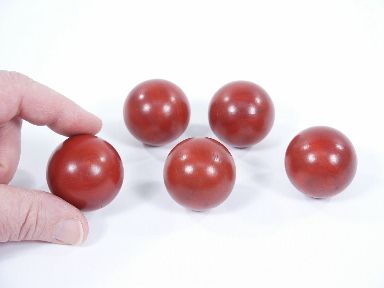 Rarely does one see such an early set of this classic effect of the Multiplying Billiard Balls. These in the 1 1/2" size having 4 solid balls and 1 shell in French Polish Finish of Red. The 4 balls are in very good condition and the shell has a 5/8" hairline opening that when pressure is applied goes practically invisible which means with the right treatment can be made closed. Includes facsimile of original illustrated instructions. | |