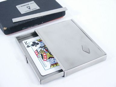 This case is quality made of stainless steel and is essentially a locking style drawer box which will enable *Vanish *Production Vanish Exchange or *Restoration of a Playing Card. This case has the diamond shape ornament originally placed there for a monogram to personalize the case as the case was thought by spectators to be one that held cigarettes. Special unlocking tool and case are both trademark stamped. Includes illustrated instructions and in the original box. Condition very fine. | |