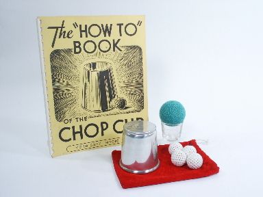 A highly polished metal Chop Cup along with *One gimmicked Chop Ball and Three ungimmicked *A Shot Glass, *A large Final Load Ball all with *Cloth Drawstring Bag and *32 page book with illustrations entitled "How To" Book of the Chop Cup, copyright 1980. Cup and Balls in very fine condition.