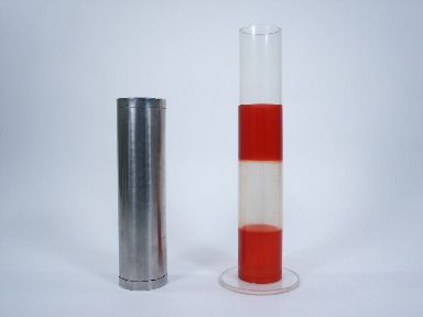 After doing a wine and water routine where wine and water is poured from the same container the magician shows a tall cylinder and places a tube over and pours from a pitcher of clear water into it. The cover is removed and the audience once more see the wine and water separated within the cylinder itself! In the words of Merv Taylor, "It's a great finish!" This is a rare item of Merv Taylor made out of lucite and having a stainless steel cover. This was produced as an adjunct to the professional magician's already established wine and water routine. No instructions. Condition fine and rare. | |