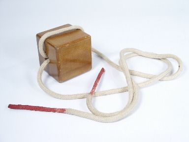 From the Bob Dowd Collection comes this earliest block release from rope using a polished solid hardwood block 2 1/2" in size along with the rope with red tipped ends. This is still the best block from rope release and one that can be fully examined by a spectator. From 1945 and includes 2 pages of instructions with illustrations by Hahne. Rope with soil and some finish absence from block. Condition fine. | |