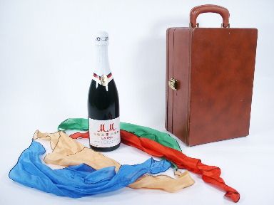The magician opens a champagne bottle with a bang after which four different colors of drinks are poured and then a string of dry silks is pulled from the bottle with colors that match the drinks! At this time the bottle may be wrapped in paper which is later broken open and two flower bouquets make their appearance.