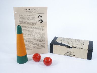 As produced by John Snyder Jr., this includes the cone and two balls along with routine and patter by Ralph W. Hull. Includes 4 pages of illustrated instructions giving various moves for the effect of a ball vanishing and reappearing in a cone. As the box label states, extremely amusing to spectators a real trick and one you will be sure to appreciate. Condition very fine. | |