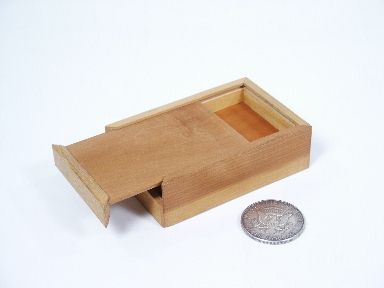 Made of wood and stamped on the underside of the lid “Made in Occupied Japan”. A coin placed in this box and lid closed may be heard when box is shaken up to the last moment of reveal showing that is has vanished! Coin not included. A seam break repair has been made to the lid and this does not affect the working of this clever mechanical box. Includes illustrated instructions. Condition good. | |