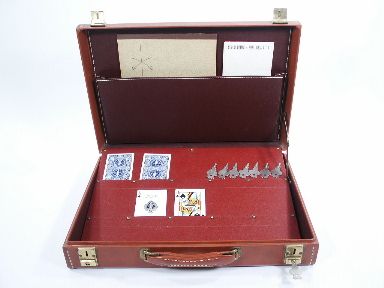Circa 1958, the ad from Richard Himber stated “A gorgeous simulated leather attache case, hand-stitched which carries your act and switches slates, cards, magazine, etc. but here's the payoff. It is the closing trick of your act wherein a spectator predicts in writing what key will open it even though he has never seen him. No stooges”. This was a fairly expensive item from Mr. Himber and includes illustrated instructions and an envelope of Mr. Himbers containing all the keys to the attache case. Condition very good. | |