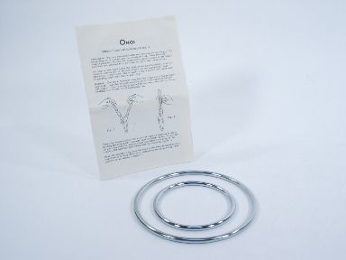 Two chrome plated rings of 1/4” stock, one that is 4” in diameter and the other 6” in diameter are shown and the large ring is threaded onto a handkerchief (not supplied). The small ring is then passed over the two diagonally opposite ends of the handkerchief and allowed to drop down on top of the larger ring. As long as one hand holds the ends of the handkerchief, it is obviously impossible to remove either of the suspended rings. However, in full view, the smaller ring is pulled off, apparently passing right through the large ring! All items may be offered for examination. This is the original effect along with an added effect that may be done with the smaller ring and a piece of rope. Includes illustrated instructions. Condition very fine. | |