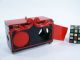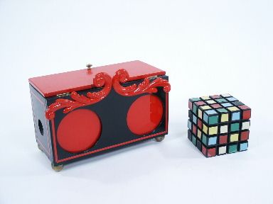 From 1984 and using a 3” cube looking much like the puzzle famous around the world. The cube is placed in a wooden chest and the magician states that the cube has vanished. One of the front panels as seen in the circular opening is slid away and the audience may see clear through the one side of the chest. Not content that the cube has vanished the audience is quick to let the magician know that one side opening is still covered.