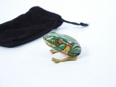 This makes use of an early tin litho mechanical wide up toy frog that is stamped "Made in U.S. Zone Germany". The key for winding which is merely a square post hollow sleeve over key is absent but this would be an easy matter to have made. Includes 3 pages of instructions for use with this for selecting the chosen card and more. Includes velvet drawstring bag for Hoppy. Condition very good. | |