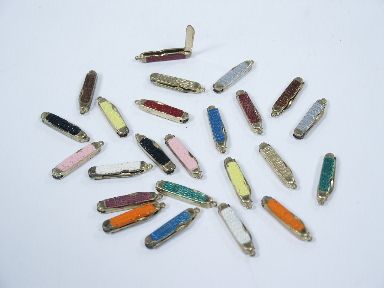 An original set with 24 miniature knives to be used as a finale where a knife pushed into your hand changes to a lot of small multi color knives. Includes 4 pages of instructions. From 1975. Condition fine.