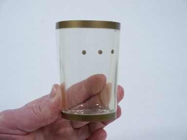 The magician walks out with a glass of liquid which he drinks. A wand is picked up from the table and used to tap the glass which the audience hears as it is actually happening. The wand is laid aside and the glass is lowered into a paper bag. The paper bag is now folded flat and dropped to the floor! The glass has vanished. Includes glass and illustrated instructions. Condition very fine.
