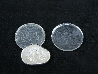 The original Doc Zola Silver Extraction is made with the clear form of a Walking Liberty Half Dollar image. Along with this you will find a Silver Extraction effect made by Johnson Products which includes the Kennedy Half Dollar form and chunk of metal with a faint image of the Kennedy Half Dollar Eagle. Instructions are included for the Johnson effect. Condition fine.