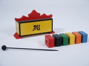 For the Collector of Early Alan Warner items this charming micro magic effect based upon the popular Bloxo is of his sought after painted works in wood. A Pagoda style cabinet with six different color blocks of which the two spectator's selected blocks after being placed within and impaled to secure with a rod free themselves from the rest of the blocks. Measures 4" wide x 2 1/2" high x 1 1/4" deep. In very fine condition and a rather elusive piece to acquire. | |