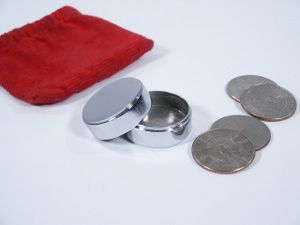 This beautiful box is made of heavy steel with a weighted bottom which enables that part of the box to right itself at important moments in the routine. This will hold 4 half dollar size coins and is plated and polished to a beautiful shine. Includes velour drawstring bag to keep it nice. If you reference the book New Modern Coin Magic by J.B. Bobo you will find a chapter devoted to work with coin boxes and this box was designed after the style shown in the chapter. (Coins shown not supplied.) A beautiful box from the early high quality years of the Original Rings N Things. Condition first rate. | |