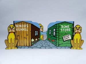 The effect is familiar to an earlier Run Rabbit Run and this rendition by Jack Hughes is eye appealing to all. Keeping little doggy Bonzo in his kennel is difficult when the bone store is just paw steps away. Includes routine that is entertaining. On the front right side you will find a break still together perhaps from a bump at some time or another. This does not affect performance. Condition very good. | |