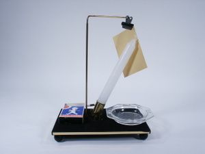 Design and original routine by Goran Klyve. A totally self contained unit that is well made and may be used in a variety of ways for comedy impact depending on your style of performance. Includes two pages of instructions in English. The premise for the candle is so that an envelope with a borrowed banknote may be held in front of to show the bill is really inside. Things go haywire as the borrowed bill in envelope are accidentally caught fire by the candle slowly tilting over catching it afire. Not seen in the photo is the fact that the holding rod for the envelope extends to a height of 14" from the platform. Condition very fine. | |