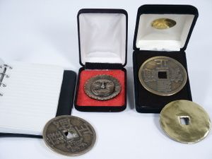What you have with this appears to be a unit by Jack Dean being the sun medallion and his special jewelry box which enables loading along with the extra of a 2 1/2" giant Asian coin of which there are two and the memo book is set for the larger Asian "Medallion". Along with this is a jewelry box which has a third Asian medallion that is fixed in the box so it may be opened and shown before tipping over into the performer's hand which already holds the medallion before handing it directly to a spectator for the reveal.