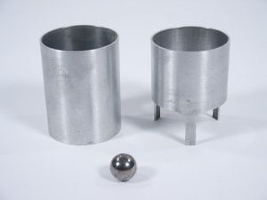 Showing 2 metal tubes a steel ball bearing and a square of thick glass the magician stacks one tube upon the other with the glass in between and rests all upon a saucer. The ball is dropped in the top tube where it is heard to strike the glass and a quick moment then the ball is seen to arrive in the legs of the bottom tube striking the plate! You will have to supply the glass as it is absent and the saucer as well as it is ordinary. Includes instructions. Condition very fine. | |