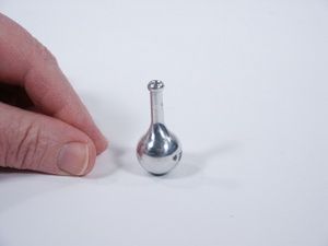 This charming spun metal bottle which the performer has lay down and stay down yet when a spectator is asked to do the same it will not happen! Some performers are actually able to hold the bottle in their palm up hand and cause it to lay over without the use of a gimmick. Includes directions for the first effect. Condition very good. | |