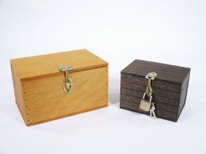 The largest chest measures 6" wide x 4" deep x 3 1/2" high having a hasp and loop closure and the inner chest measures 4 1/4" wide x 3" deep x 3" high having the same type of closure hasp. Even though both chests may be padlocked the performer is able to introduce an article such as a watch or finger ring or the like via a mechanical arrangement that is really clever. Includes 1 padlock with keys. Condition very fine. | |